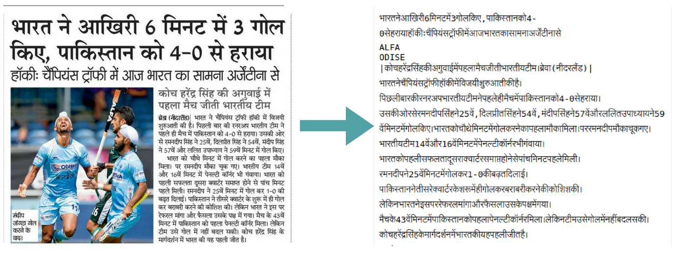 OCR: Currently using the Google vision OCR for text detection in an image.As Google-OCR [more] works for a very few Indian languages [Hindi,Marathi,Punjabi,Telugu,Malayalam,Tamil,Bengali,Assamese],a deep learning ocr for vernacular languages can be trained.[more]