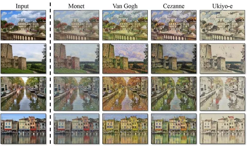 Domain adaptation — making data from one domain resemble the data from the other domain (e.g., making a normal photo look like an oil painting while retaining the originally depicted content).