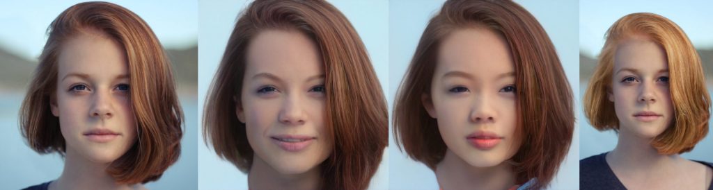 Figure 14. Generated face customization (Generative Photos). Left to right: original, adding smile and age, race editing, hair color editing.