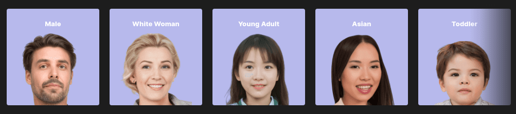 Generated Media Inc applies the StyleGan model to create synthetic facial photos of varying ethnicity, age, and gender. While the generation process is nothing remarkable (the company mentions they use StyleGAN by Karras et al. and Nvidia), the interesting point is how the partner companies use AI-generated photos.