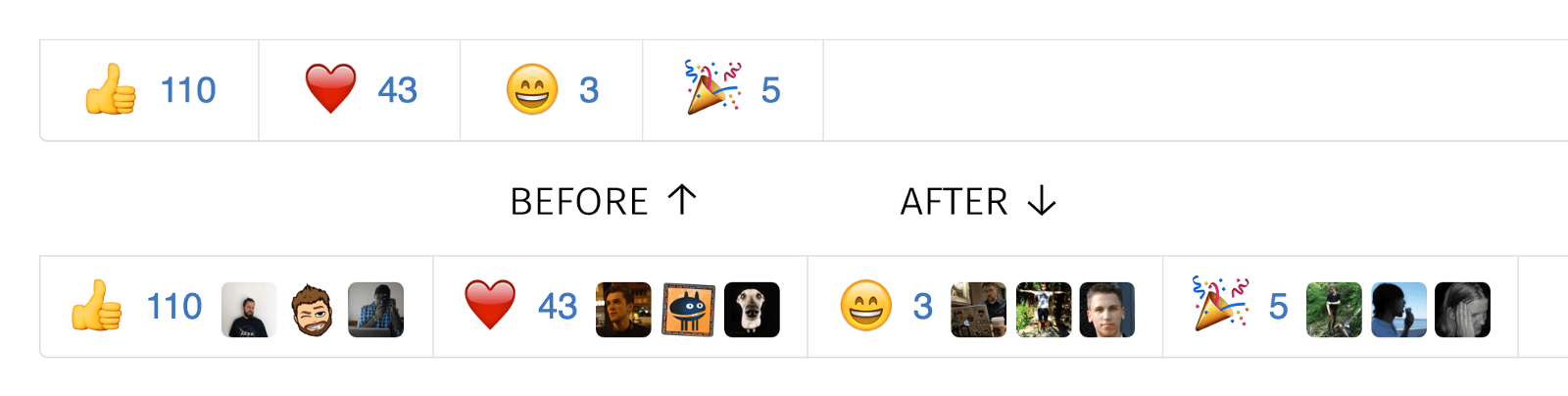 See the avatars of those who reacted to an issue, pull request, or comment. It’s so much better than simply seeing a faceless (get it?) number!