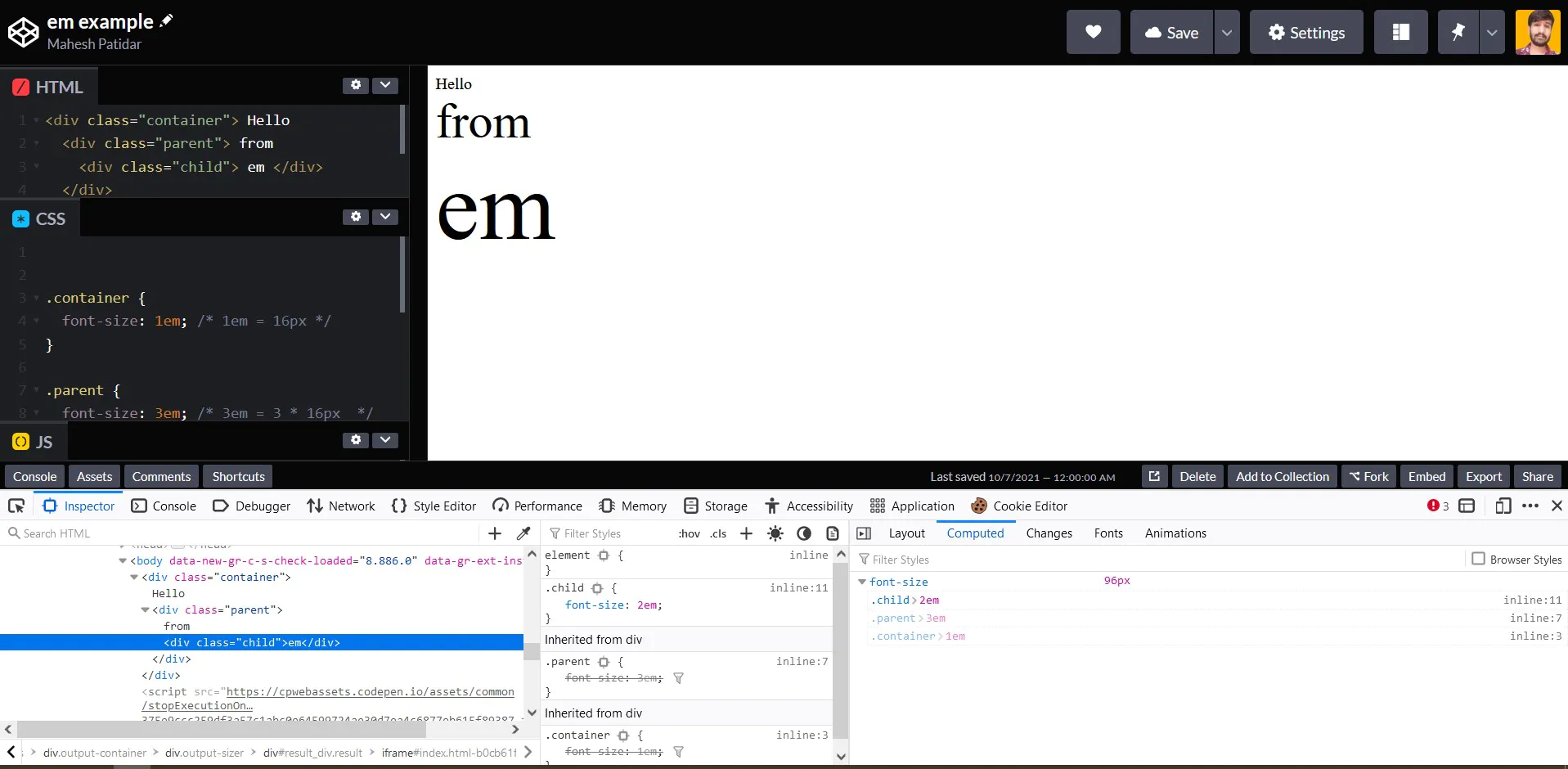 - The font size of the Parent is 3em i.e 3 x 16px ( parent font-size), so it becomes 48px.