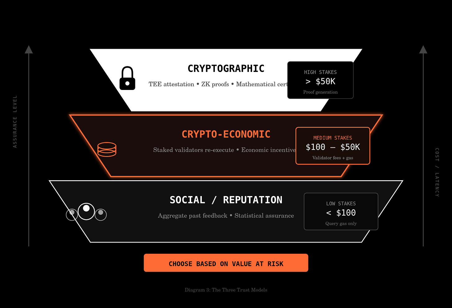 Crypto-economic verification occupies the middle tier. Staked validators re-execute or audit work. Economic incentives align verification effort with stakes. More expensive, but provides concrete loss recovery through slashing. The risk: validator economics are complex and the ecosystem is immature.