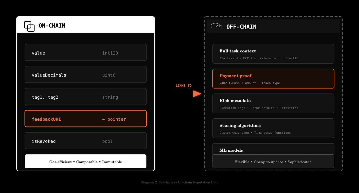 Off-chain, detailed feedback files can include rich context: task specifics, A2A or MCP references, payment receipts, execution logs. This is where nuance lives.