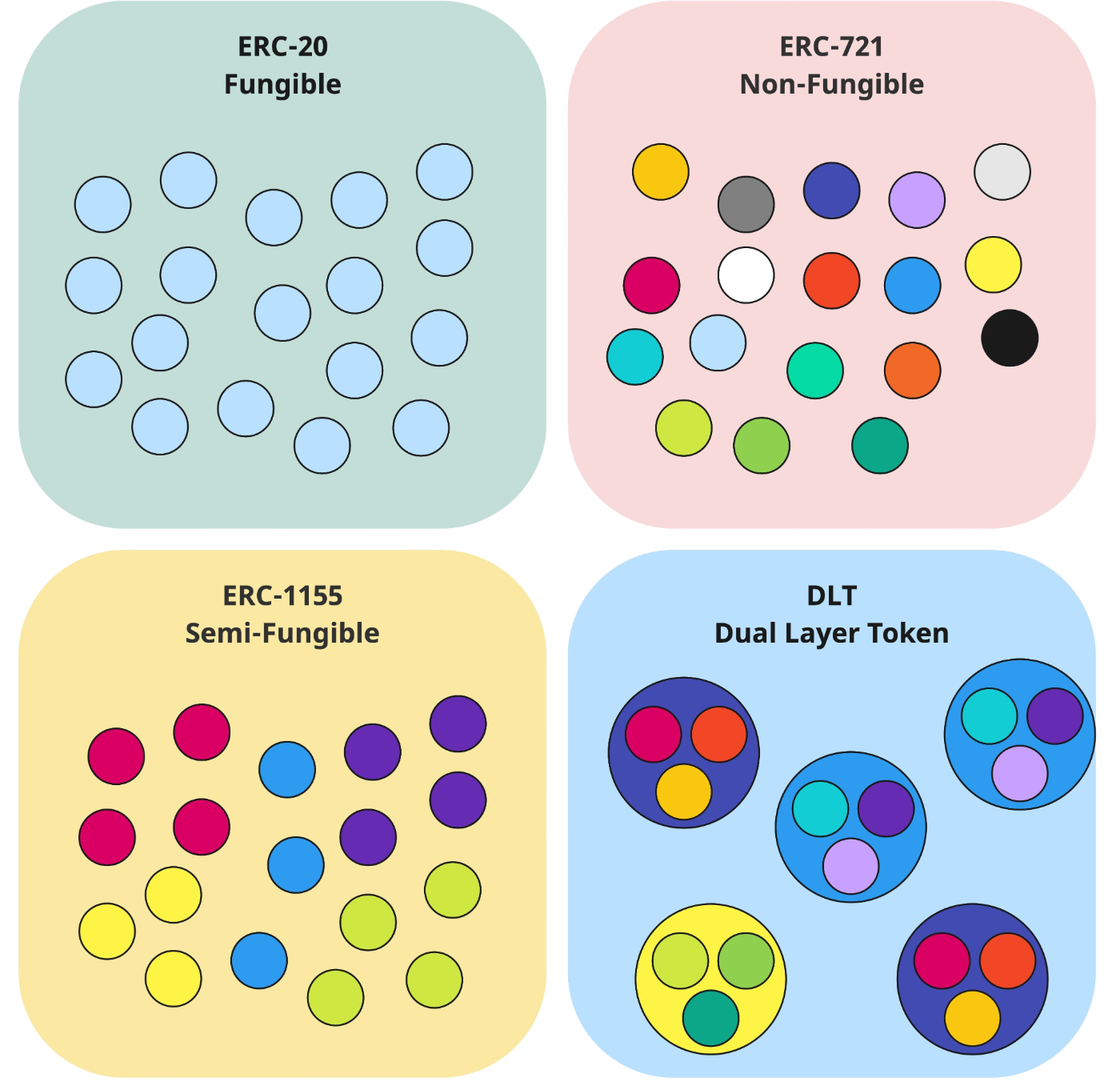- ERC-20: This is the most common token standard used for fungible tokens. Fungible tokens are interchangeable, like currency. One ERC-20 token is identical to another. However, ERC-20 doesn’t support non-fungible or semi-fungible tokens, and it doesn’t allow for fractional ownership.