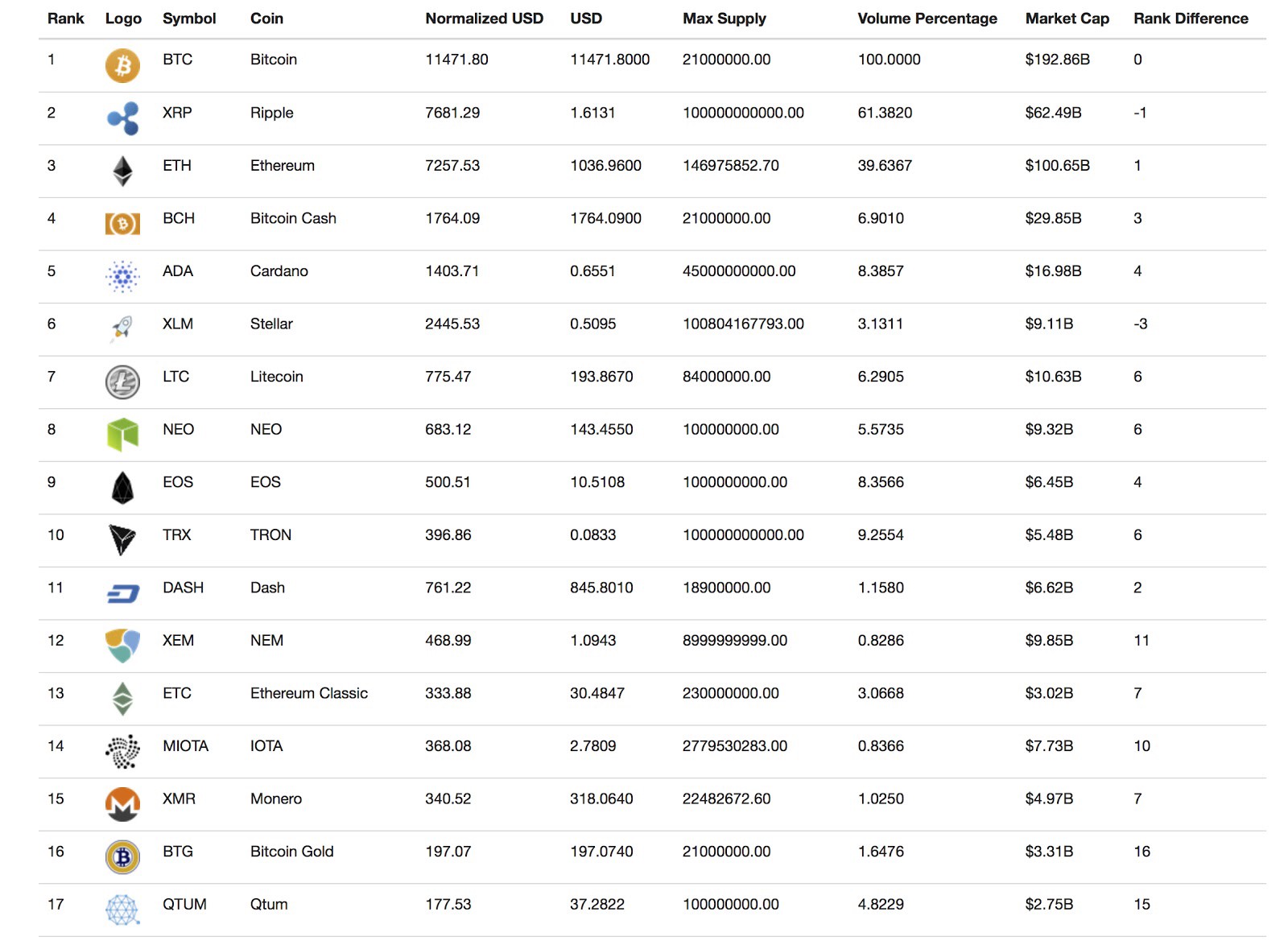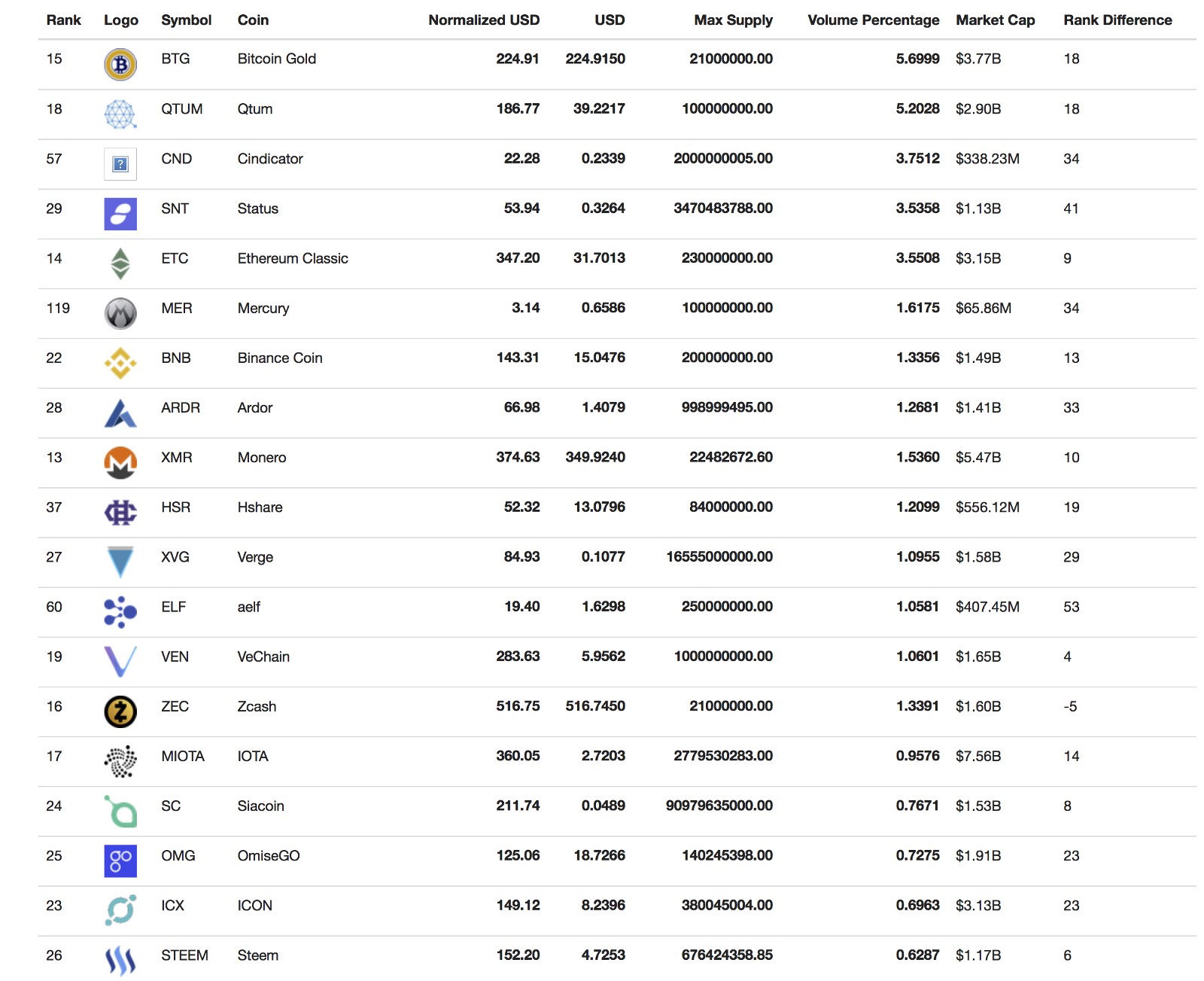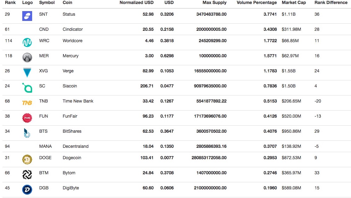 - It shows top coins based on market cap (based on current supply), normalized price (based on total supply) and trading volume.