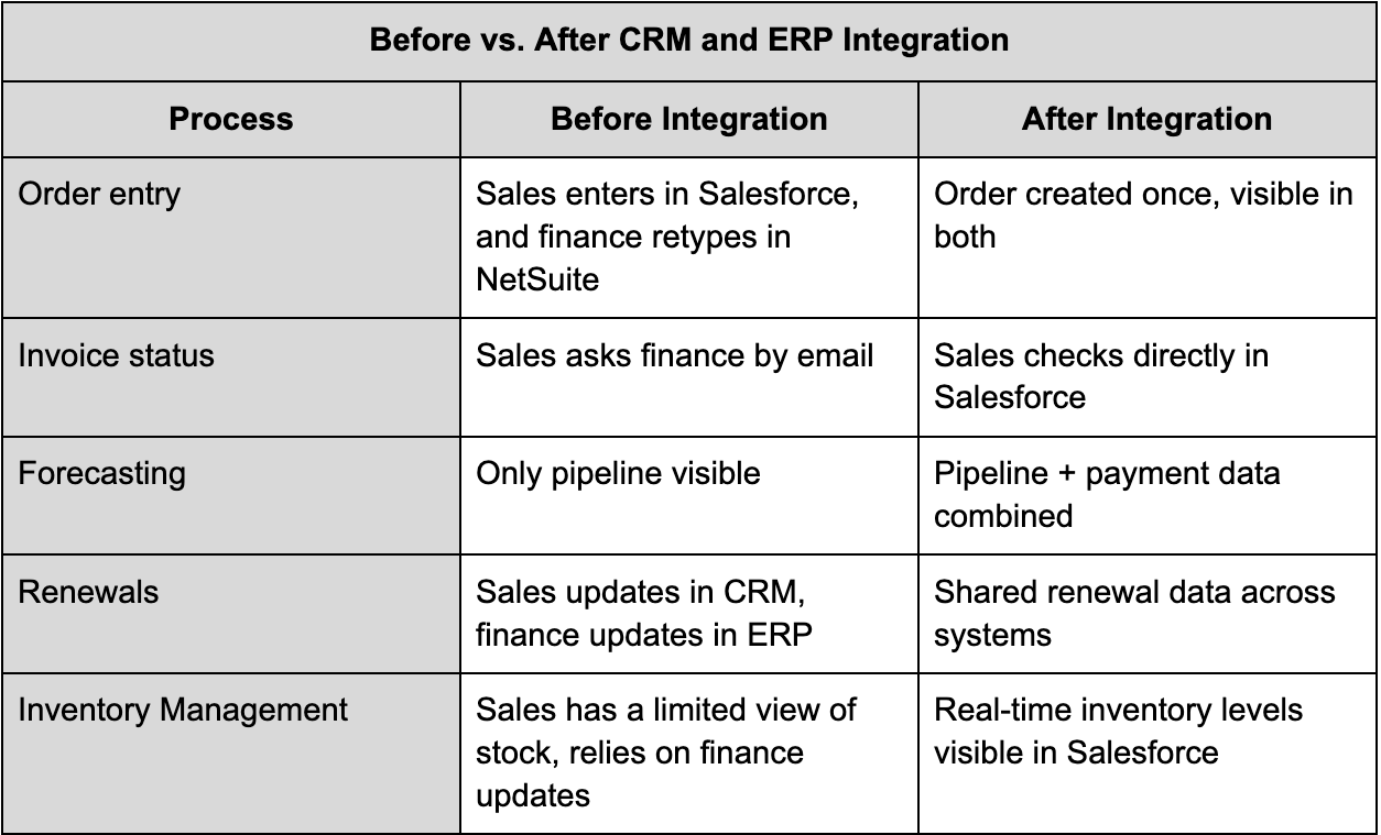 Now, let’s look at a before-and-after comparison to see how integrating Salesforce and NetSuite changes daily processes.