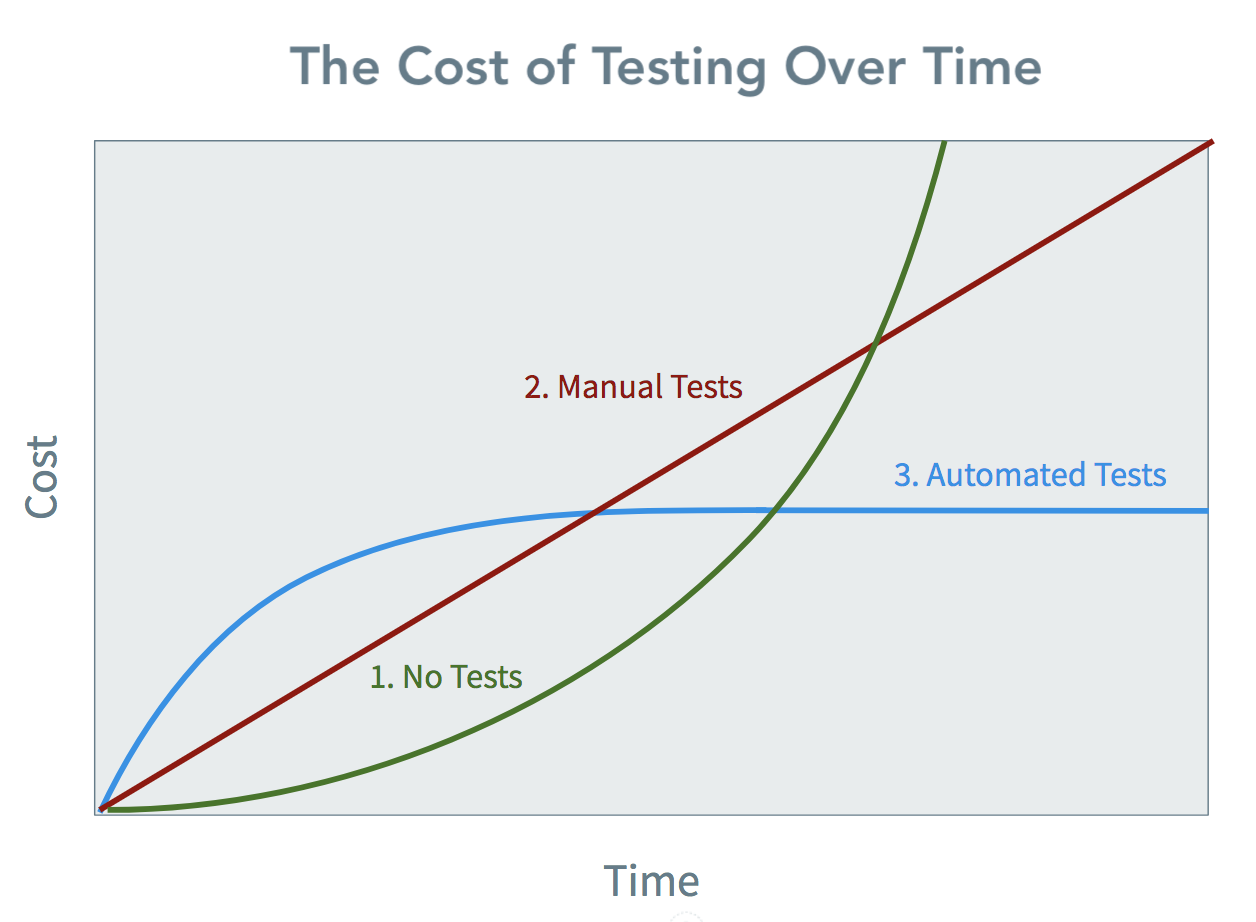 Initially, the cost of maintaining code with manual tests or no tests is a lot lower than that of writing automated tests. However, as the diagram below illustrates, it soon becomes prohibitively expensive to scale your application without automated testing.
