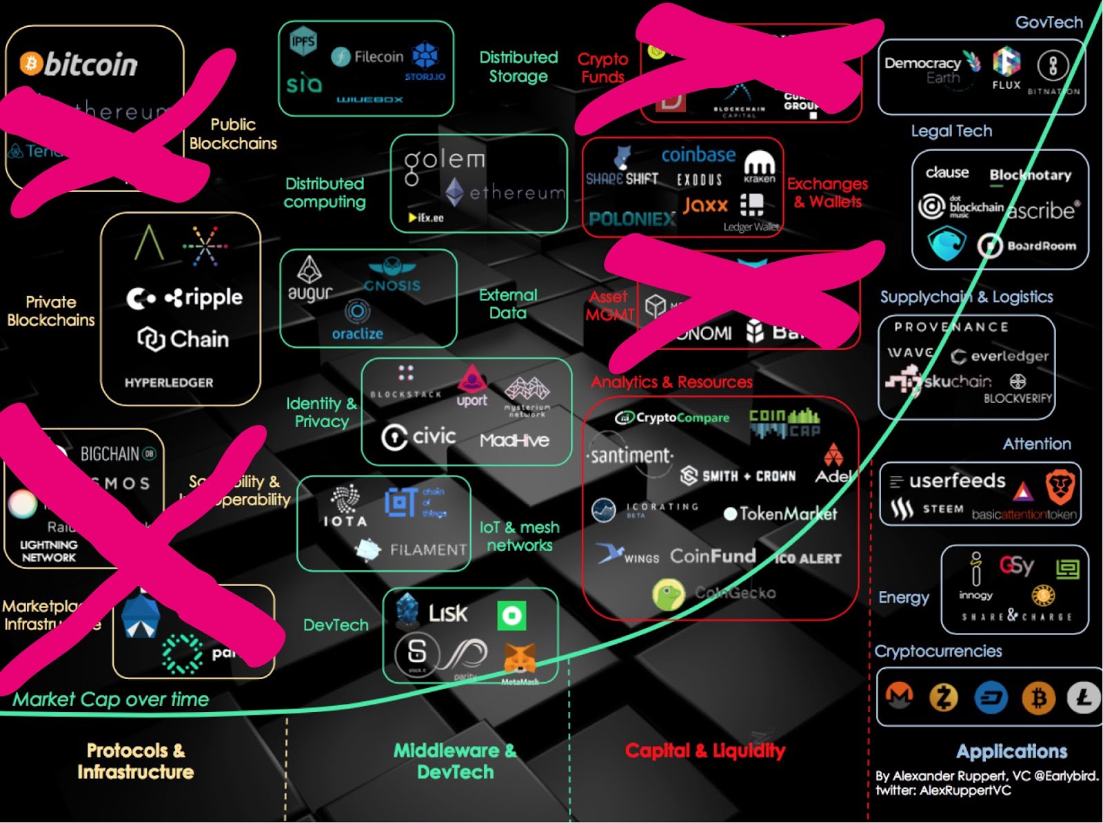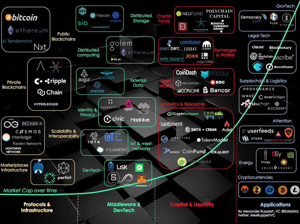 Some areas of activity are just not compatible with the ICO concept and need to be filtered out from the map. The crypto space can be segmented in various meaningful ways, but I personally like A. Lange’s four-sectors visualisation: