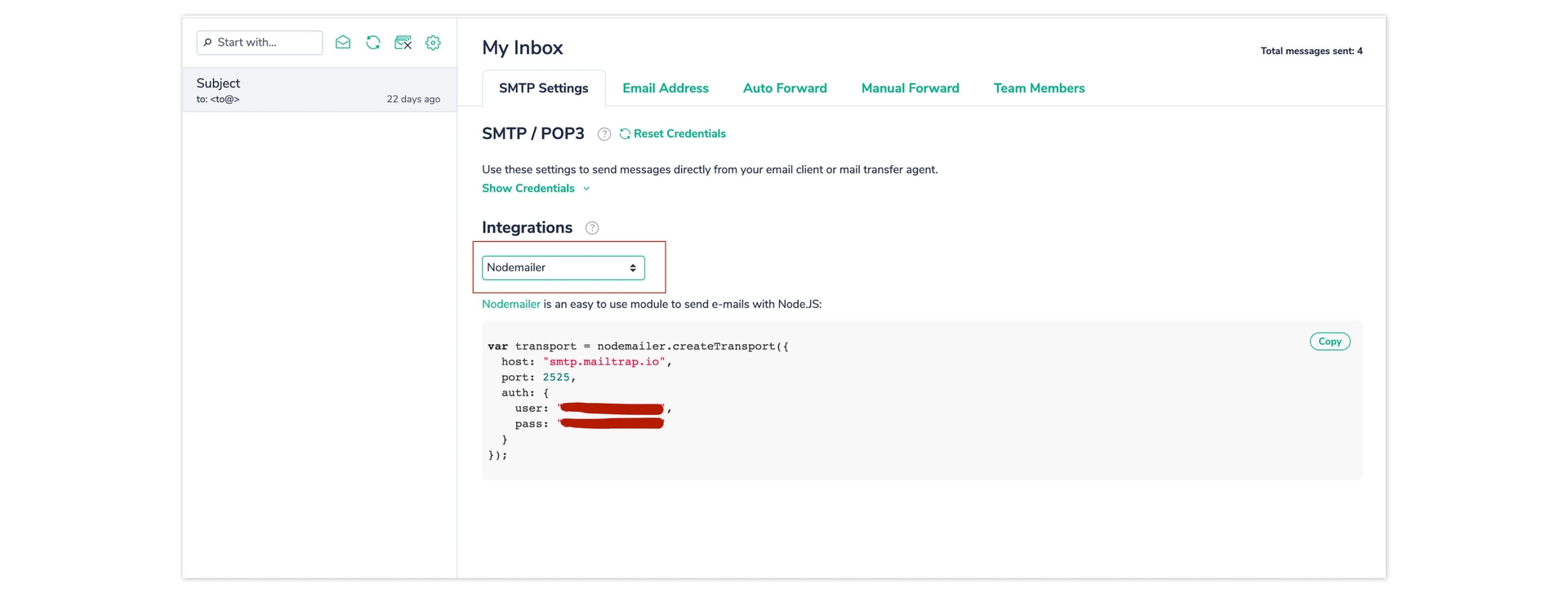 Create a Mailtrap account if you don’t already have one. In the Integrations dropdown on the dashboard, select Nodemailer and copy the credentials displayed.