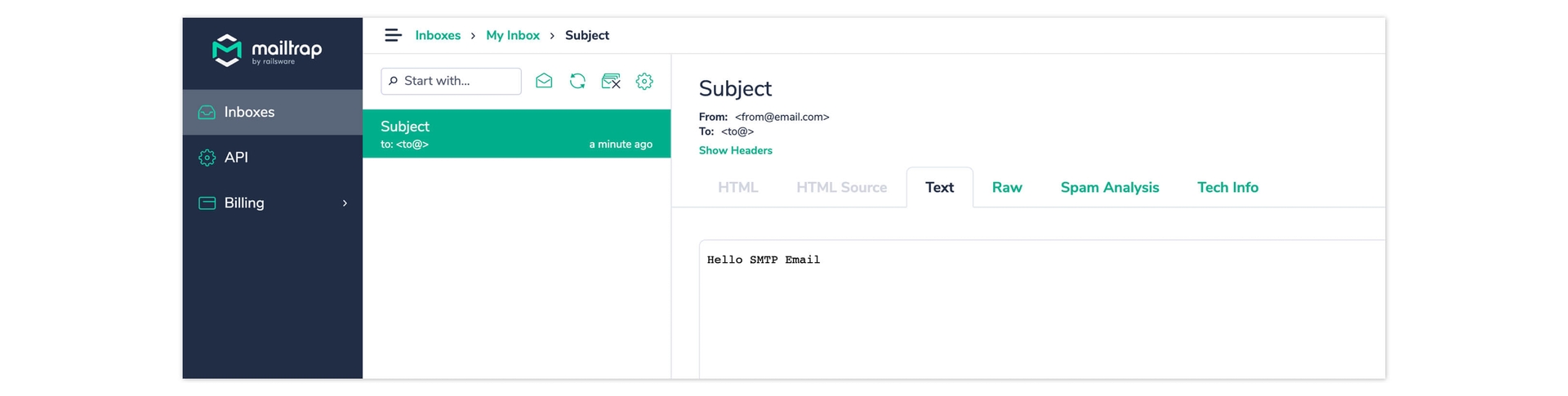 Substitute the host, user, and password with the Mailtrap credentials you copied from the dashboard above. Now you can send an email using the sendMail method of Nodemailer’s createTransport function.