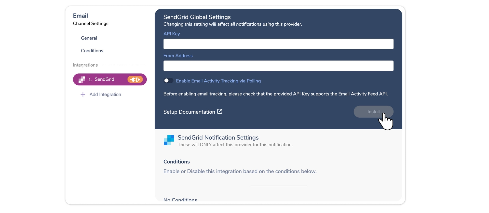 Click on the plug icon in the sidebar on the left and select SendGrid or any other provider you would prefer, from the available list. To integrate SendGrid, just add your API key and a verified SendGrid “From address.”