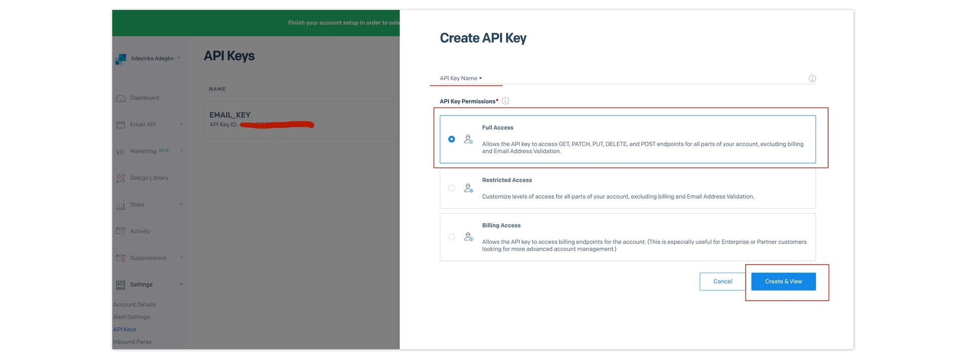 To create an API key, go to Settings > API Keys on SendGrid’s dashboard, then click “Create API Key.” Give the key a name, select “Full Access,” then click “Create & View.” Copy your API key and keep it safe for later use.