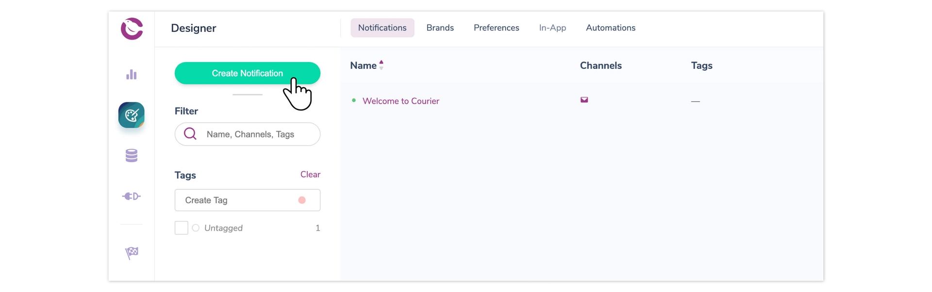 To use Courier to send transactional emails, head to the Courier dashboard and select Designer on the lefthand menu. Then, click the “Create Notification” button.