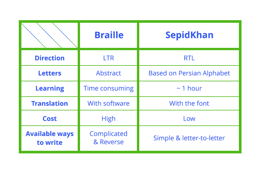 But SepidKhan is a script and a font. And because it is not a different language with different grammar or vocabulary, it can do the translation by changing the font of a standard Persian text and everybody can write with it without the need to use a software/hardware. One could think of hundreds of books or articles that can be converted to a blind-friendly script by one click.