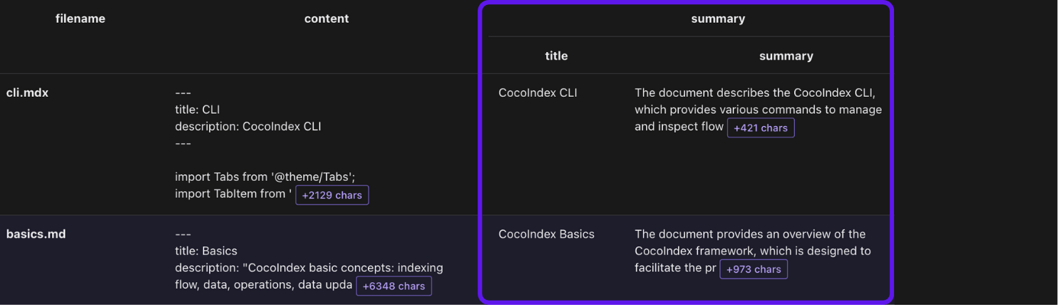doc["summary"] adds a new column to the KTable data_scope["documents"].