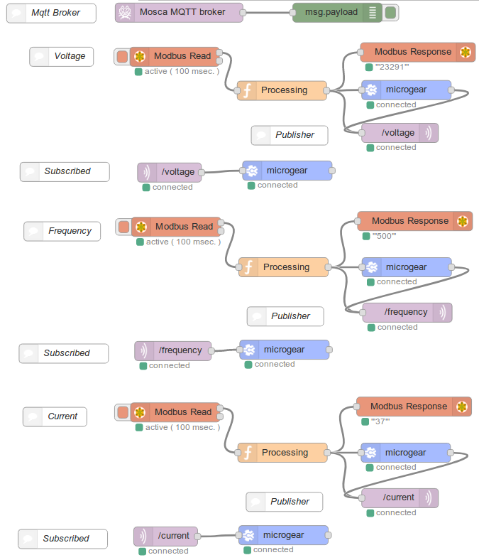 For transfering data from broker (installed on Simatic) to NETPIE, first the Simatic should be authenticated by NETPIE, for this purpose microgear node (netpie) is used. Once the device is authenticated, connection between Simatic and NETPIE establishes and data gets transmitted using Mosca mqtt broker. Modbus node is used to read data from Modbus Energy Meter.