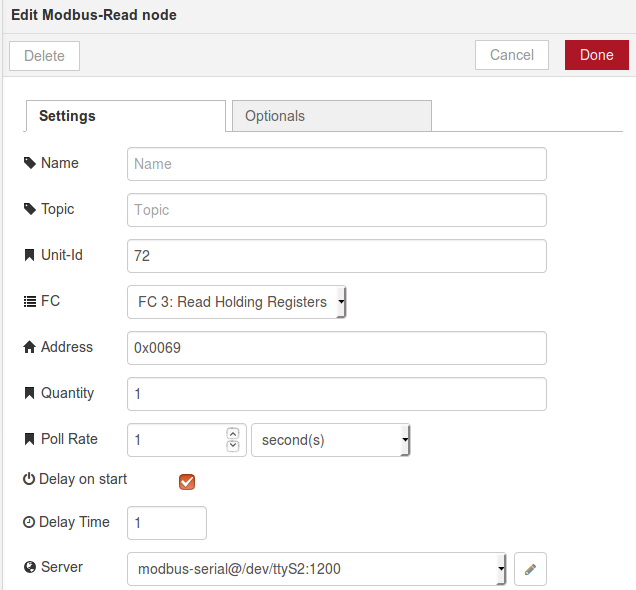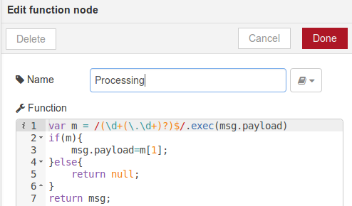 The data read from Modbus Energy Meter will be enclosed in brackets (Ex: Voltage value: [23200]). To remove brackets and extra characters on data we use function node.
