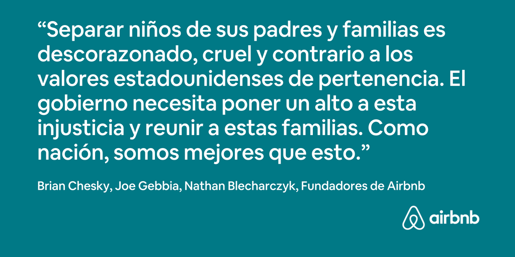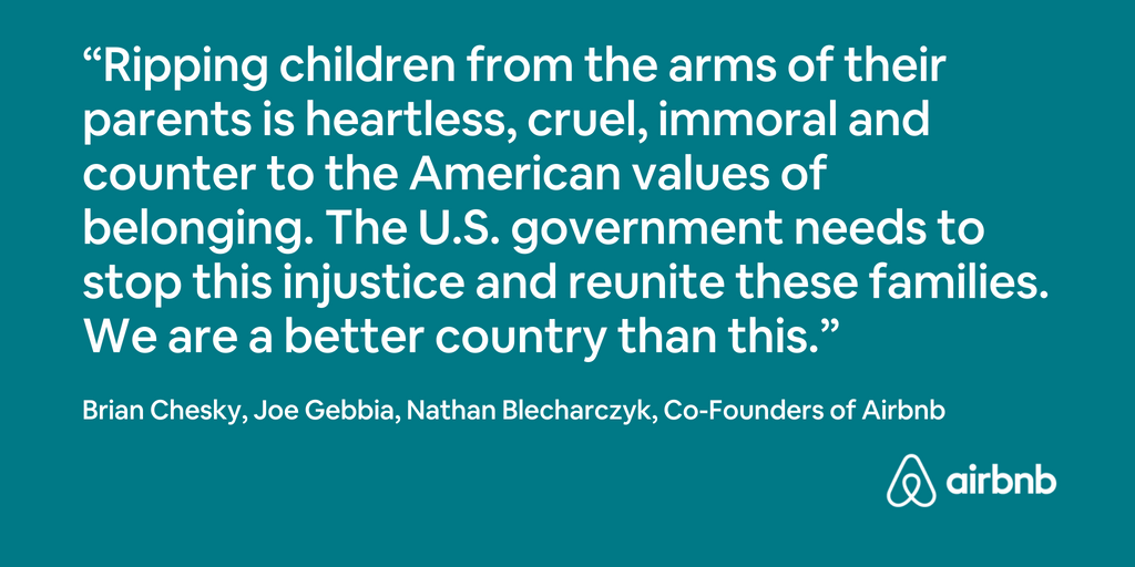 Brian Chesky, CEO at Airbnb, and his co-founders Joe Gebbia and Nathan Blecharczyk, have released a statement — posted in both English and Spanish on Twitter — calling for the US government “to stop this injustice and reunite these families.”