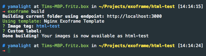 Then, execute “exoframe build” and pick a name for your image (or just leave it as a default one):