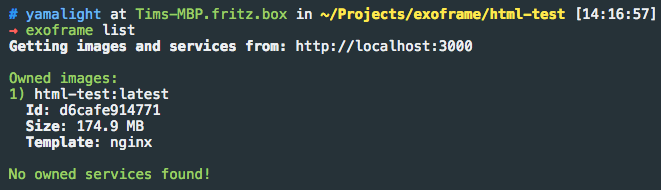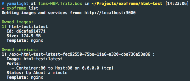 Once the build is finished, you can get list of your owned images and services using “exoframe list” command: