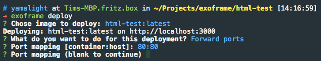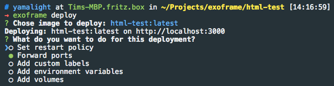 Once you’ve selected the image you want to deploy, Exoframe will ask what exactly do you want to do during the deployment — do your want to forward ports, specify restart policy, etc?