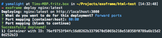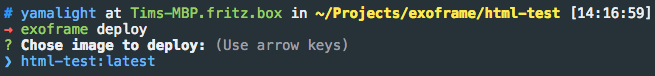 Now that you have built a new image, let’s deploy it.Simply execute “exoframe deploy” and you will get a list of available images to deploy — no need to remember all of your image names: