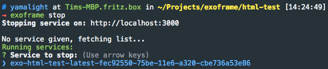 Now that you’ve seen that service works, let’s stop and remove it.You can use “exoframe stop” command to stop your running services and “exoframe rm” to remove stopped services. Once again, you don’t need to remember names of your services, if you don’t provide service name — Exoframe will present you with an interactive list:
