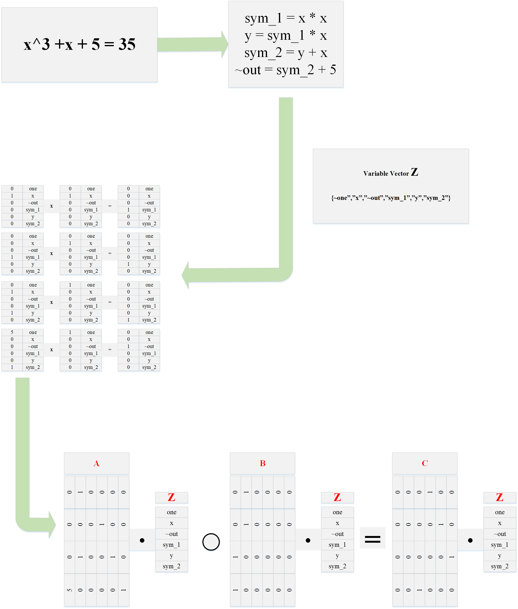 Zero-knowledge proof algorithm Marlin is a R1CS based proof system, that, given a coefficient matrix parameter I = (F, n, m, A, B, C) and a set of valid assignments z = (x, w) ∈ F^n, among which x is public information, namely Instance and is private information, namely, witness if Az ∘ Bz = Cz is established, R1CS is established.