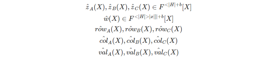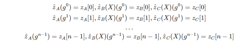 - Define polynomial (LDE) ^zA(X), ^zB(X), ^zC(X) ∈ F<|H| + b[X]z^A(X), z^B(X), z^C(X) ∈ F< |H| + b[X] for vectors z_A, z_B, z_C satisfying that the value on the group H is consistent with the vector, where the order of the group H are equal to the length of the vector (assuming they are both), that is: