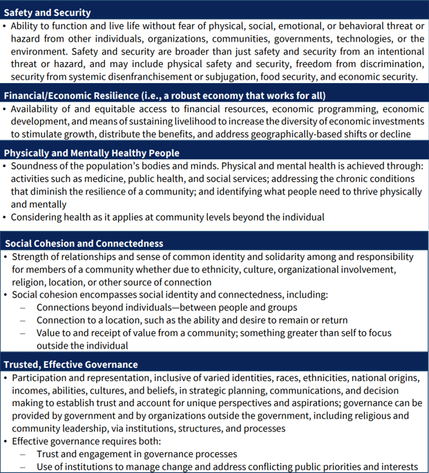 The Grand Pathways Framework identifies five principal societal dimensions of resilience, recognizing there are many more that could be used to characterize resilient communities and to serve as organizing constructs to identify science and technology gaps and opportunities. Over time, the Framework may be expanded based on further research and practice. The societal dimensions presented in this section and used in the case studies are intended to be a flexible, ever-evolving means to frame resilience science and technology discussions.