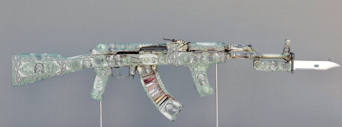 This art piece is a synthesis of everything wrong and right about today's society; the American dollar bill represents the core foundation of commerce, the AK47 represents destruction, how much money has been generated from wars.