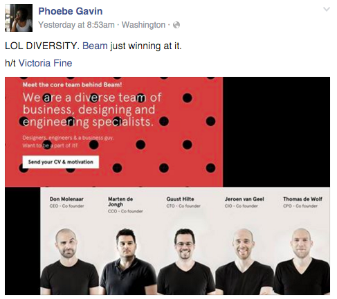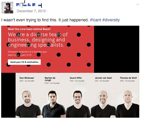 Beam Labs is a Dutch company and the Netherlands is literally 90% white. People of color are a rounding error in a country like that. But there is a healthy population of women so “fixing” the lack of diversity in your company is not a matter or deleting a word on your “about page”.