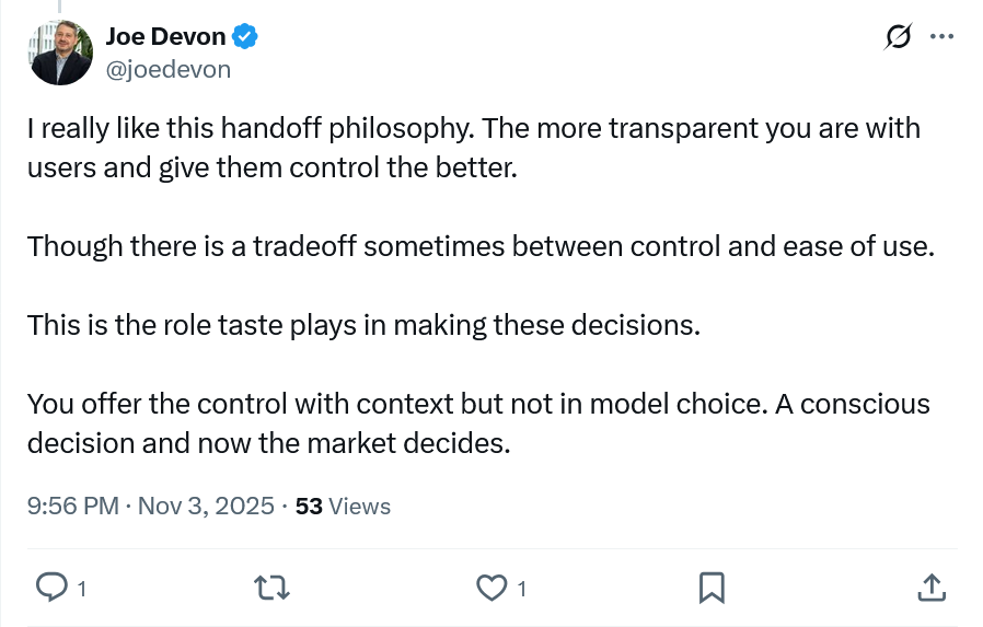 One commenter framed the decision as a question of taste. Amp, they noted, is giving users control over what context moves forward through Handoff, but (notably) not which model handles it — a deliberate constraint that favors consistency and simplicity over full flexibility. It’s a trade-off between power and polish, and, as the commenter put it, “now the market decides."