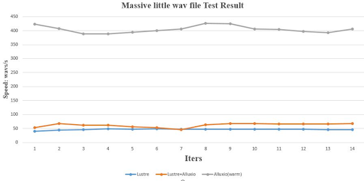 We can see that, during the first read, using Alluxio with cache warmup (Alluxio, warm) is nearly 10x faster compared to reading directly from the distributed file system (Lustre). Because when Alluxio reads the first time, it needs to sync the metadata and cache data at the same time, the real advantage of caching is still not reflected yet. In the second read, since the data have all been brought into the cache, the performance depends on the cache hit rate of Alluxio. From the above test results, we can see that there is a significant speedup.