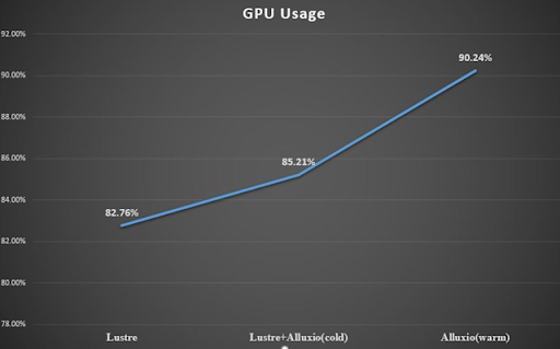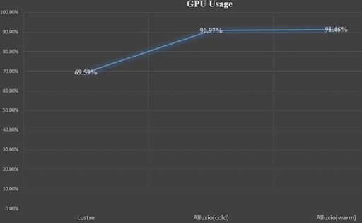 With a faster data read, we also improved overall GPU utilization. By monitoring the utilization, we found that the GPU usage kept at about 90% using Alluxio cache warmup. At the same time, we can store cached data in the memory, effectively offloading the underlying storage.