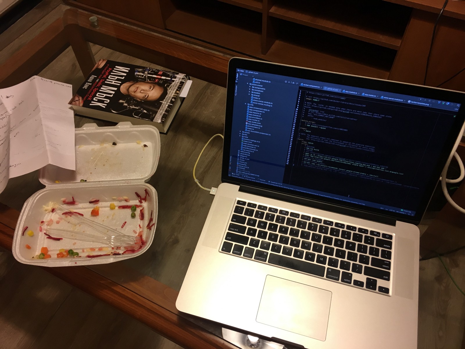 Eastern European Tech Entrepreneurship summarized in one photo — $2.30 dinner, Elon Musk autobiography and late night coding sessions on a $4,500 MacBook Pro bought during a Work & Travel program in the US. The impromptu drag strip outside makes work and sleep a mental challenge.