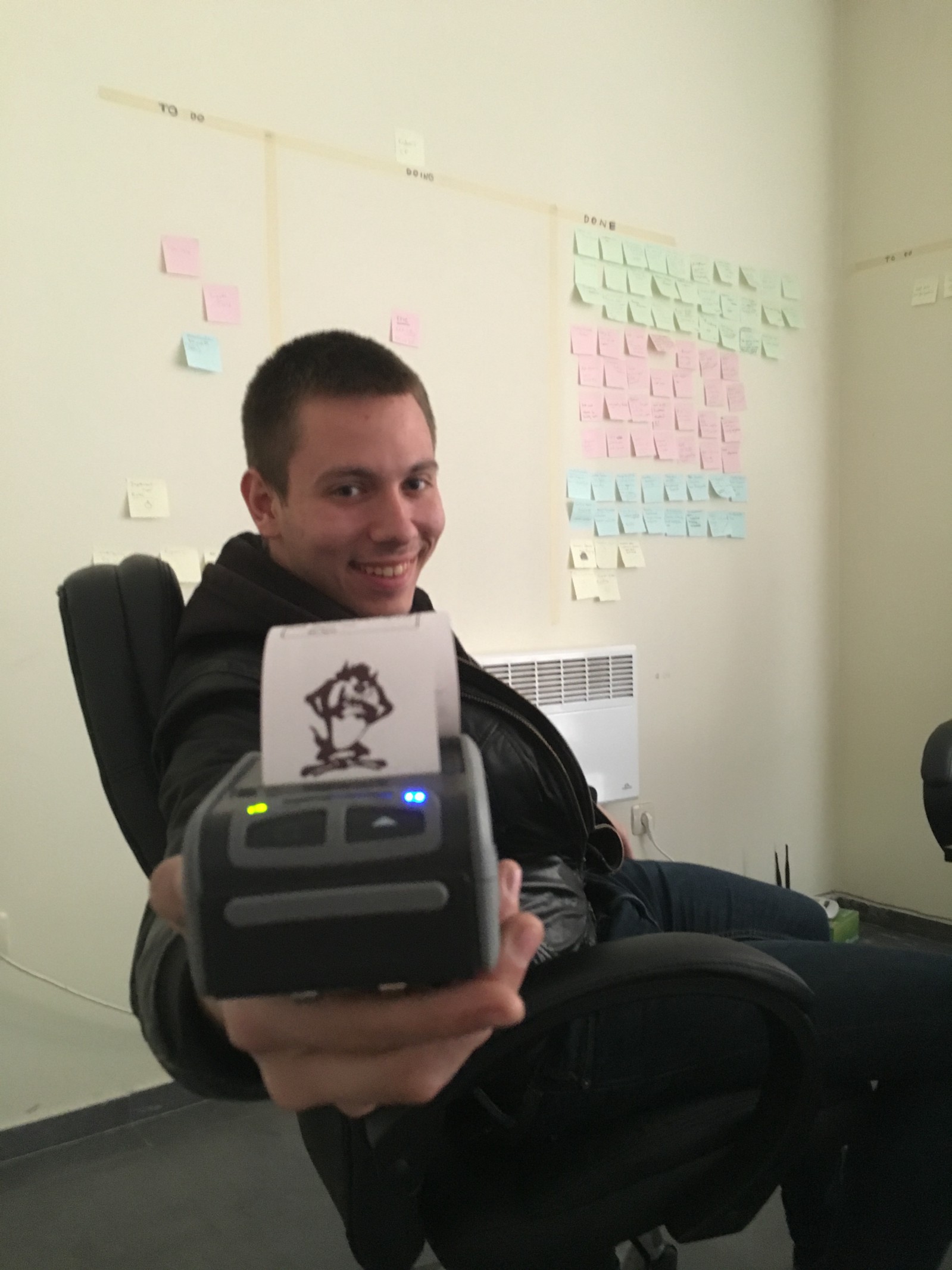 Gavril showing a mobile printer used by the cashiers who collected the resident’s payments through our iOS app. Behind him — Centroida’s scrum board.