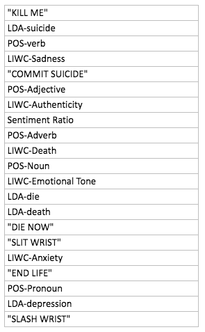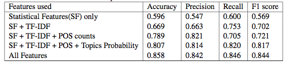 The table above shows the variation in performance of the Random Forest classifier with the inclusion of the various features. The precision reduces by a small amount with the inclusion of Topics probability feature implying that a greater subset of tweets is classified as suicidal due to the LDA unigrams included via Topics probability features, but is finally boosted by the inclusion of the LIWC features. The POS counts also lead to a reduction in the recall, which is compensated with the subsequent inclusion of Topics Probability and LIWC features. The drastic improvements are attributed to the TF-IDF, POS counts and LIWC features in terms of most evaluation metrics. It is observed that the proposed set of features perform the best in conjunction with Random Forest classifiers, and the improvement in performance with the inclusion of each feature validates the need for the extraction of that feature.