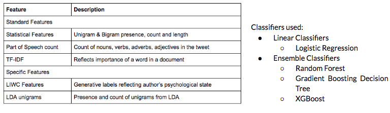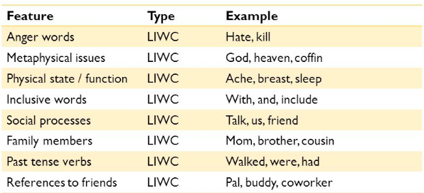 One of the most important features are the LIWC Features. Linguistic Inquiry and Word Count program (LIWC) (http://liwc.wpengine.com/) is a transparent text analysis program that counts words in psychologically meaningful categories. Empirical results using LIWC demonstrate its ability to detect meaning in a wide variety of experimental settings, including to show attentional focus, emotionality, social relationships, thinking styles, and individual differences.