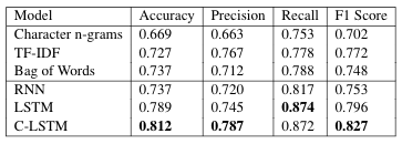 Deep Learning architectures show promise in Sentence level classification when clubbed with word embeddings. Two models, Vanilla-RNN and subsequently CNN-LSTM(The CNN LSTM architecture involves using Convolutional Neural Network (CNN) layers for feature extraction on input data combined with LSTMs.) were used. The motivation for using these models was their ability to capture long term dependencies in text. The architecture for the Vanilla RNN is shown here. Vanilla RNN doesn’t perform very well due to the vanishing gradient problem, and thus becomes inefficient to learn long distance correlations in tweets. CNN-LSTM was used specifically to alleviate the problems in an RNN using an LSTM to capture long term dependencies with relatively more insensitivity to gap length unlike RNN. CNN was used to extract features more efficiently from word embeddings.