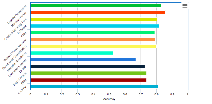 The proposed features used in conjunction with the first four models described in the Classification section supersede the baseline models in terms of performance along most metrics. The LSTM model has the highest recall, owing to its ability to capture long term dependencies, however its overall performance in terms of accuracy and F1 score is relatively less. Both SVM and Rule- based classification don’t perform as well as the proposed methodology, owing to the lack of features used in these models that are not suitable for learning how to classify tweets with Suicidal Ideation. Both of these methods are more suitable in a general domain, however, the features in the proposed methodology are more specific to the particular problem domain of Suicidal Ideation detection, particularly the LIWC features and Top- ics probability. Lastly, the Negation Resolution method performs poorly on the dataset, due to its inability to adapt to a vast and highly diverse form of suicidal ideation communication and its implicit rigidity. This in comparison to the proposed methodology, is unable to effectively learn and extract the essential features from input text, and thus does not perform as well.