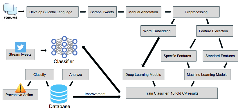 Development of an accurate and robust binary classifier that can identify content on social media that may potentially hint towards suicide activity to prevent suicides and provide help. This involves: