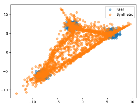 The plot shows that the VAE has learned to generate data that closely resembles the original data. The synthetic data also has three clusters, and the spread of the points is similar. However, note that the synthetic data might not perfectly match the real data because the