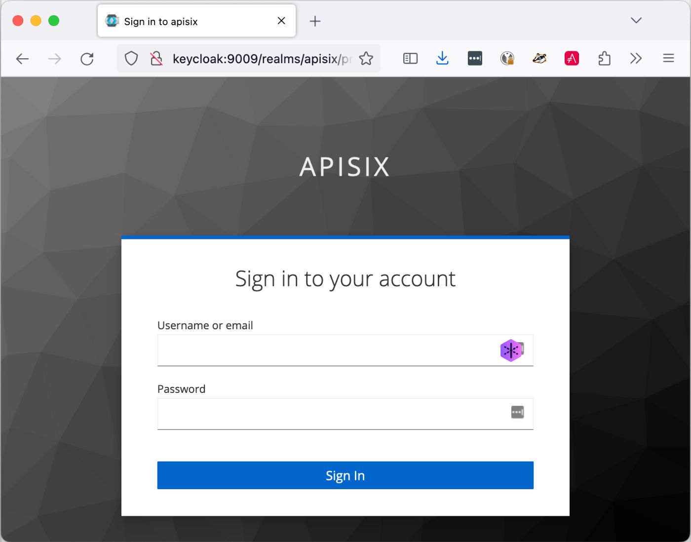 Let's try to access the application via Apache APISIX. When we browse to http://localhost:9080, Apache APISIX redirects us to the Keycloak login page: