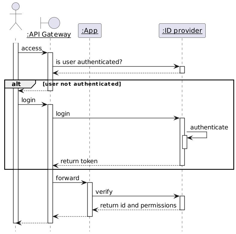 The API Gateway doesn't authenticate but delegates authentication to an authentication provider. After authentication, the Gateway forwards the request to the app. The app checks authentication and gets the associated identity and permissions.