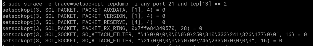 The key is SO_ATTACH_FILTER , which attaches that filter that was previously shown, plus some sizeofs etc.