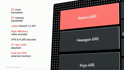 Snapdragon is the worlds first 7nm chip for a PC. There is Kyro 495, Adreno 680 and Hexagon 690 for GPU and CPU it allows 2X graphics and 2X 4K monitors. It is 2X faster than its previous generation, Adreno 680 is 60 percent more efficient than the GPU in the Snapdragon 850 Mobile Compute Platform. These GPU components provide premium mobile PC performance without unnecessarily compromising battery life. The Kryo 495 features an octa-core CPU design with larger L2 Cache, L3 Cache, and system Cache. More Caches are available so it would smooth-en the multitasking activities.