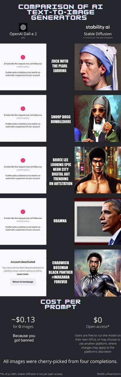 Moreover, the choice between open source products and commercial solutions is often due to censorship. For example, OpenAI prohibits generating images on sensitive topics and bans users after several attempts to generate them. The word "Ukraine" is also prohibited for text input.