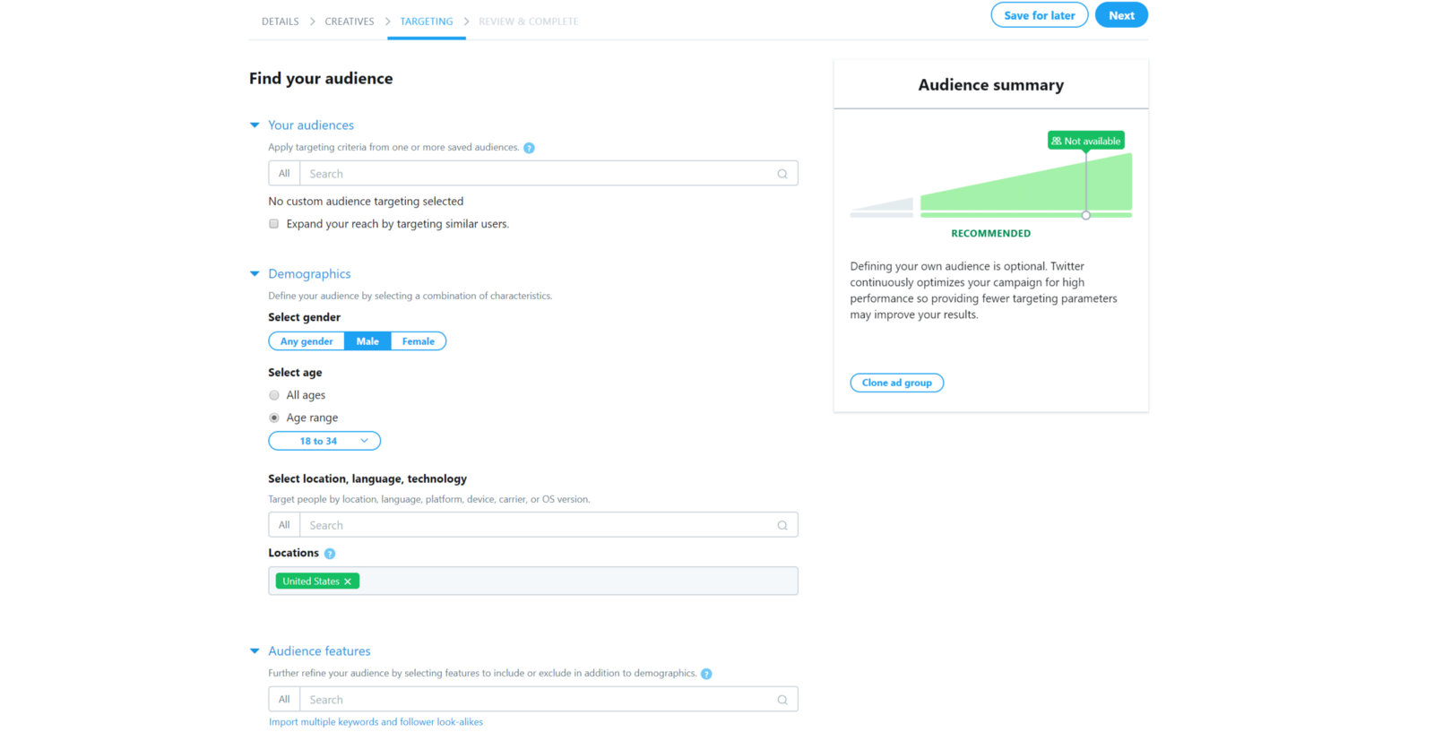 On the next page, you’ll be able to really narrow down your Target Audience. This is where you get to specify things such as the gender, age, location, and interests of a person you want to target. This is page is important; it’s the only opportunity you’ll have to give Twitter the best description you can of the person you want to ask the question to.